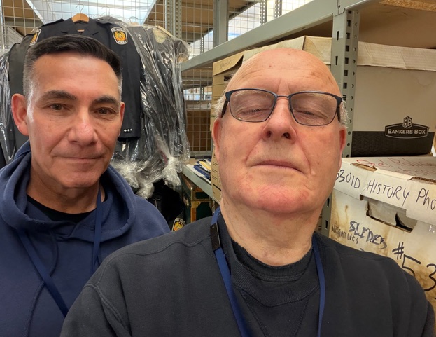 Ian has sent us  several photos of the temporary storage area of photos and items collected by the Peel Police over the years, mainly donated by retired members and bureaus which changed formats as equipment changed. ie: VHS, CDs and DVDs. He explained that they are presently working on photos, negatives, older police reports, manuals and issued equipment.  "Most weeks, a small group of volunteers meet to work on the valuable project starting with a social coffee, some light banter then our mentioned tasks. We are hoping to network with our local archives for professional storage moving forward. "