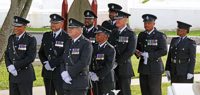 An Honor Guard comprised of Commissioner Darrin Simons, Deputy Commissioner Na’imah Astwood, Assistant Commissioner Antoine Daniels and Assistant Commissioner Martin Weekes.