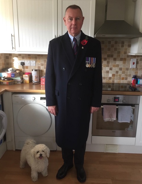 The second photo shows me in our kitchen on Remembrance Sunday 2016 about to attend our local church with the other military veterans of the village, with my dog Millie.
