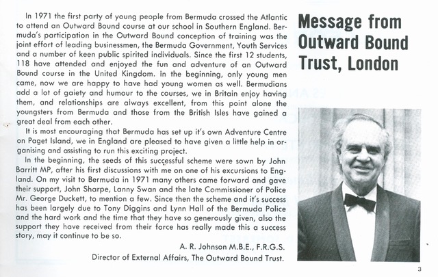 Tony also started his time in Bermuda on the beat in Hamilton, and went on to postings in “E” Department (Special Branch), in Admistration at Police Headquarters, and in “F” Department where he played an important role is the setting up of the Police Outward Bound programme at Paget Island. Attached is a report from Mr. A.R. Johnson, Director of the Outward Bound Trust, who I believe was P.C. Richard “Dick” Johnson father, paying tribute to Tony Diggins and Lynn Hall for their hard work in setting up the Bermuda OB programme.