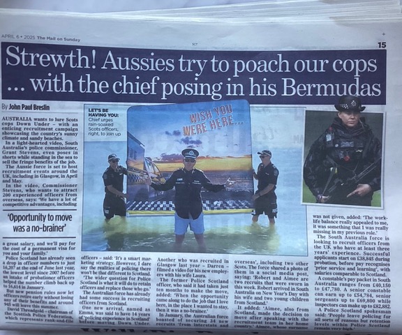 We’ve just received an email from our old friend and former colleague Ian Graham who has sent us a copy of an enticing police recruitment campaign from Australia running in the Mail on Sunday newspaper “showcasing the country’s sunny climate and sandy beaches.” In a lighthearted video, South Australia’s police commissioner, Grant Stevens, poses in shorts while standing in the sea to sell the fringe benefits of the job.